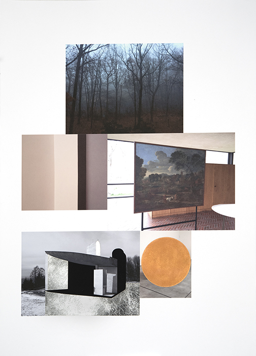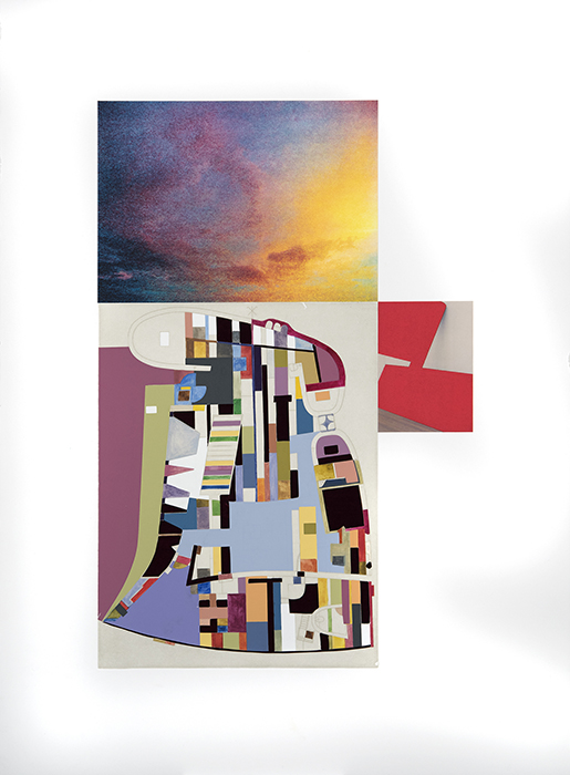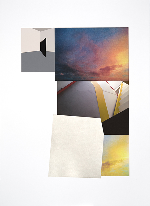 Julie Langsam (American), This Must Be the Place, 2017, portfolio of 5 prints. Digital, silkscreen, lithograph and polymer photogravure, copper, and aluminum dusted chine collé and with gold and silver leaf, on Magnani Pescia paper, 30 x 22 inches each, edition of 10. Published by the Brodsky Center at PAFA, Philadelphia. Photo by Jack Abraham.