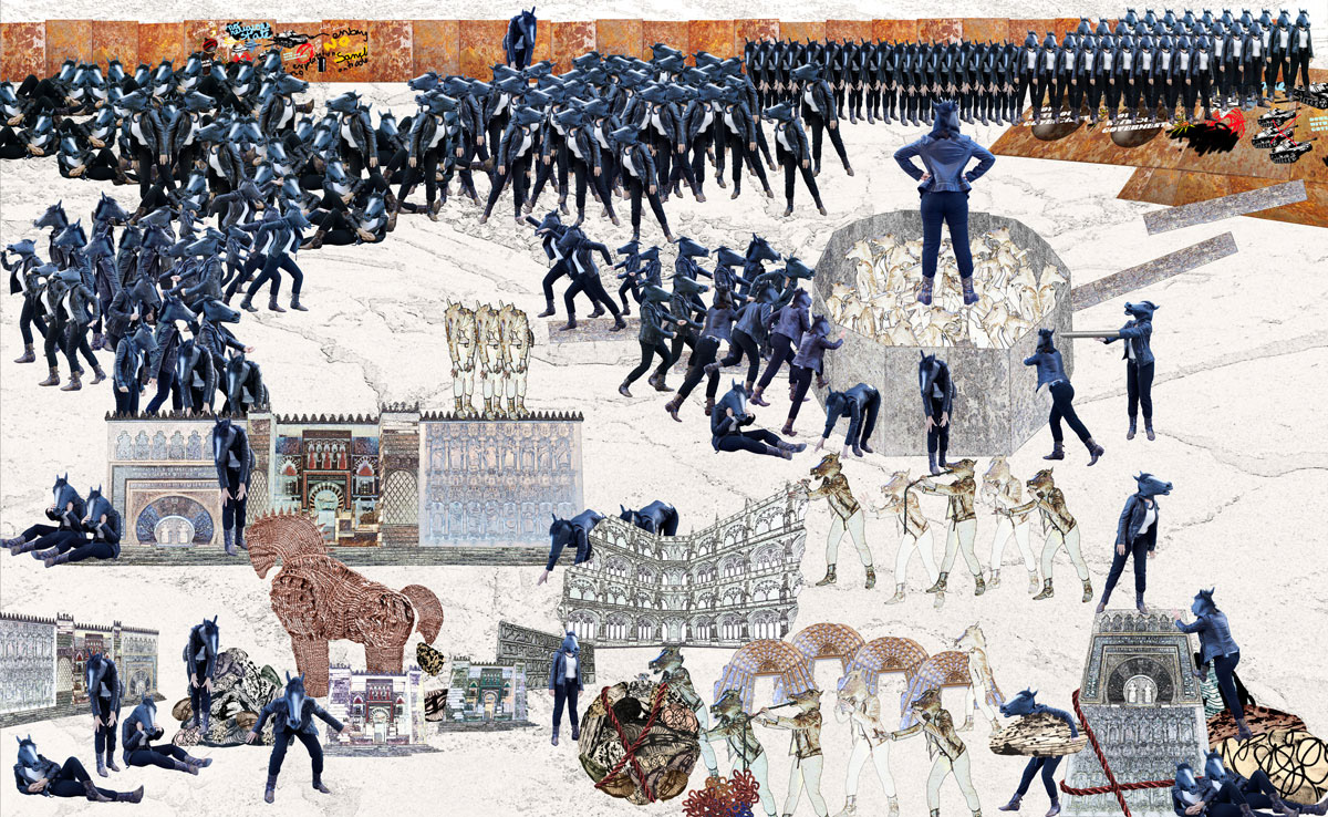 “Trojan Accords references two animations Scenarios of Breaking Down a Wall and Homeland Insecurity. It captures a narrative of conflict within a single frame. The main horse character is a postcolonial hybrid subject forged in the encounter with the occupying British Mandate mounted military. Different architectural elements reference La Mezquita and the Synagogue of Córdoba in Spain pointing to a complex of histories and locations.” – Zeina Barakeh