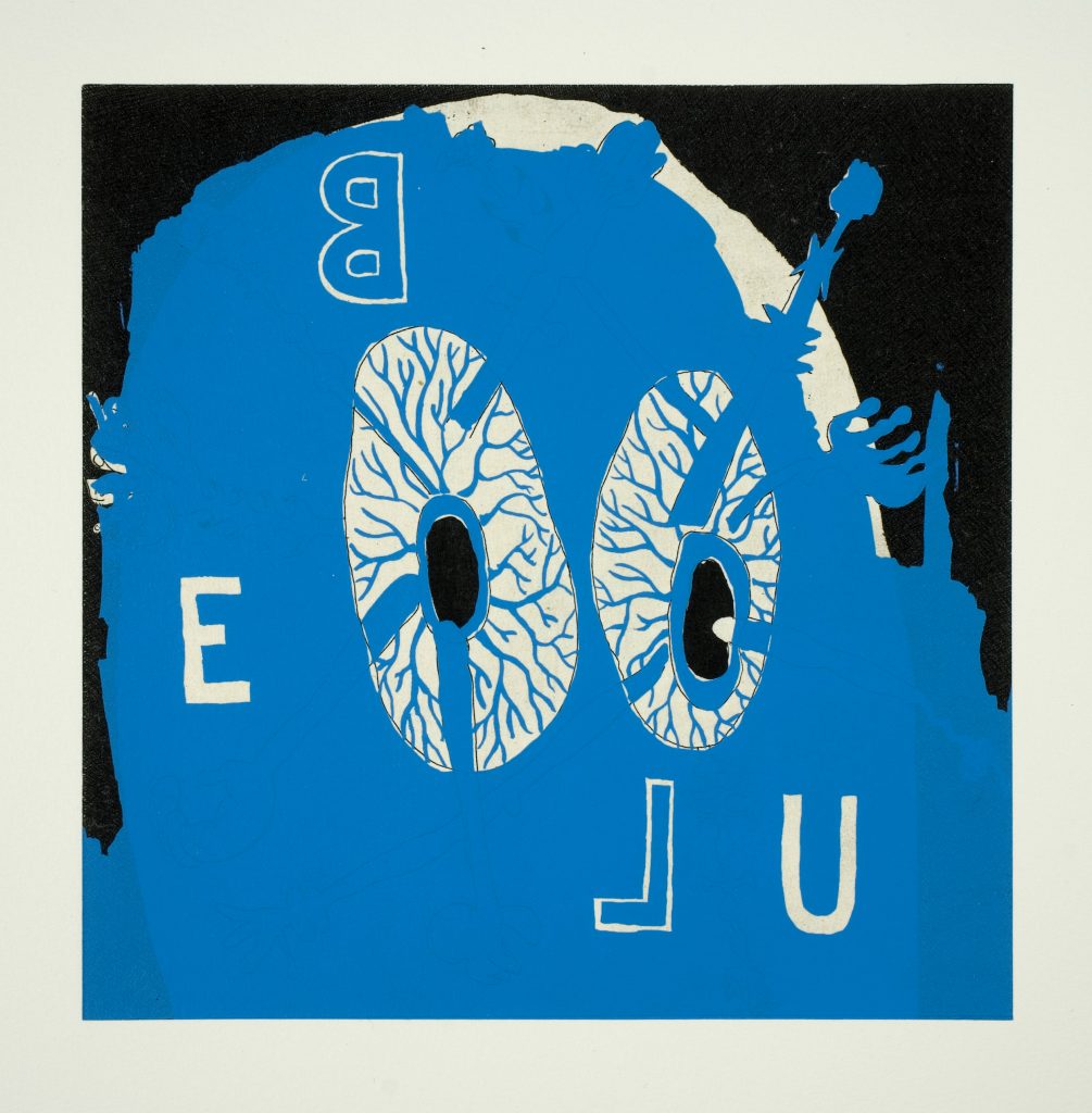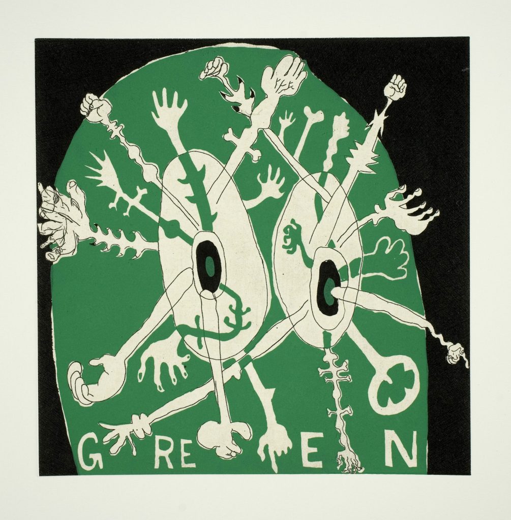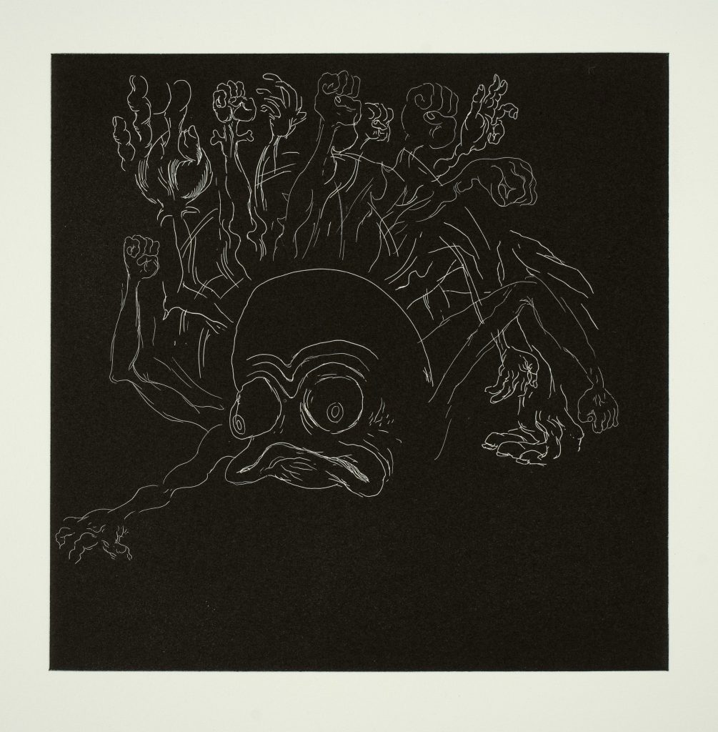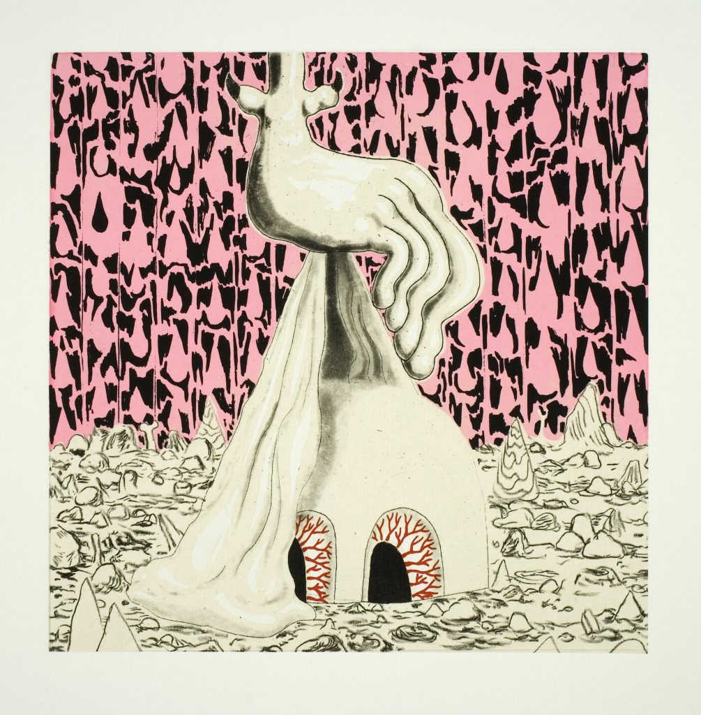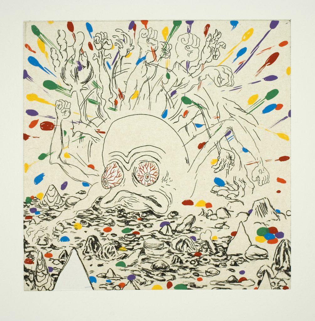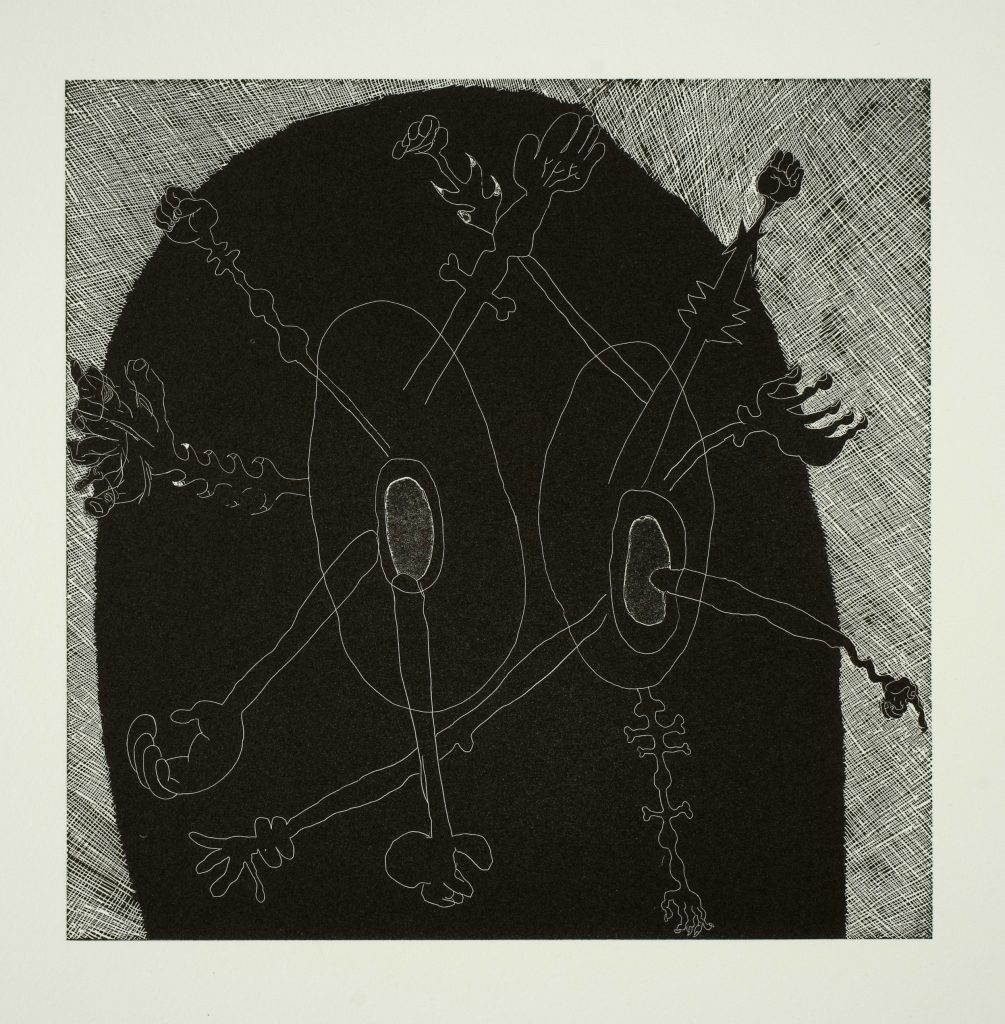 In Hancock’s fantasy universe, the world in divided into “vegans,” who are evil and permanently confined to a black- and-white underground world, and the good “mounds,” who are born and then followed in life, death, dreams and afterlife. In the narrative developed in this group of prints, the two come together in a triumph of magnificent colors. Hancock completed his MFA at Tyler School of art in Philadelphia. This portfolio is in the collection of the Metropolitan Museum of Art, New York, and the Museum of Fine Arts Houston.