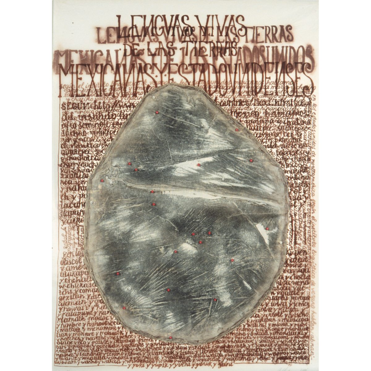 Laura Anderson Barbata (Mexican b. 1958), "Ni Todos Los Que Son Estan, Ni Todos Los Que Estan Son", 2001, lithograph on 100% abaca HMP caste, graphite rubbings and map pins, 23 x 32 inches, edition of 11, published by the Brodsky Center at PAFA, Philadelphia.