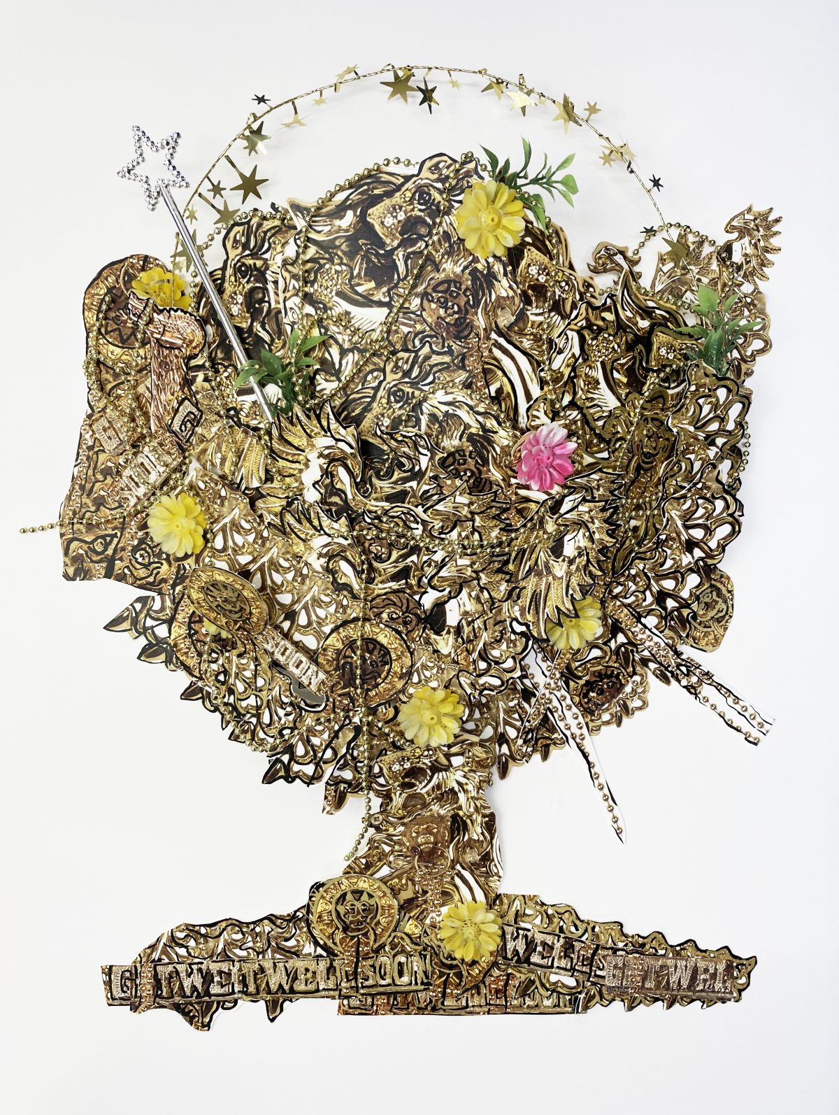 digital images with silkscreen on paper cut into 43 pieces and re-collaged into a three-dimensional object,